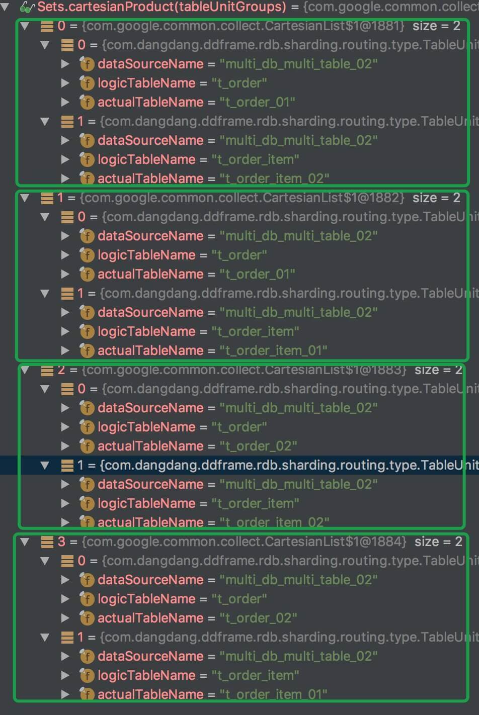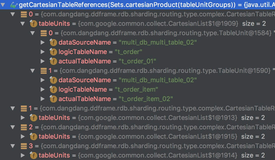 • Sets.cartesianProduct(tableUnitGroups) 返回如图(Guava 工具库真强大):