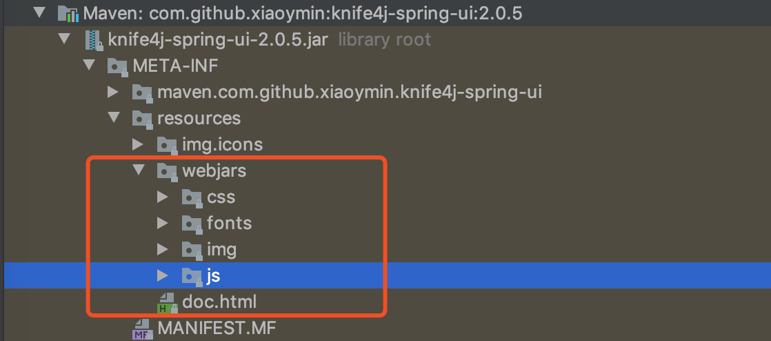 方案二,将 swagger-dubbo 提供的 Swagger UI 的静态资源,打包成名字为 swagger-dubbo-uijar 包。这样,每个 Dubbo 服务提供者的项目,引入该 jar 包即可。具体可参考 Knife4j 的 knife4j-spring-ui 的做法,如下图所示: